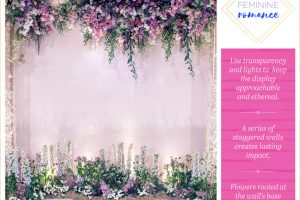 Great as a photo backdrop, this flower wall pairs pastel buds and drapey vines with white lights to create a heavenly vibe. Flowers fixed at the wall’s base create a garden illusion.