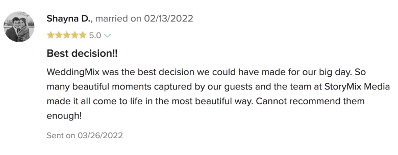 Here's the affordable photo booth experience that's easy and fun for everyone. The photo strip, boomerang, and video message features are powered by the custom Storymix booth software, ensuring a seamless and enjoyable experience for you and your guests. You also get our #1 rated photo and video app, QR code, and web upload link to capture all your guest's memories. Plus, our award-winning customer service team is dedicated to making your dream wedding a reality.